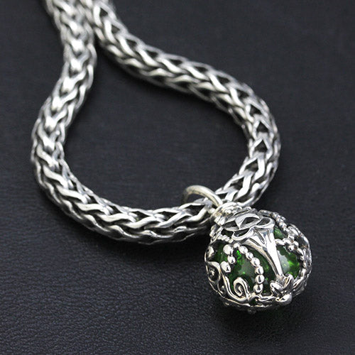 Immortal Juice is more than a bead__t is a breath of magic, a whisper from the past, a potion of dreams cradled in silver. It holds the essence of forgotten spells and secret elixirs, wrapped in the embrace of delicate vines and woven metalwork. A five-pointed star sits atop, a guardian of mysteries, securing the life force within__ deep green core that seems to swirl with untold stories. A relic, a fragment of alchemy, a token of something that lingers beyond time._