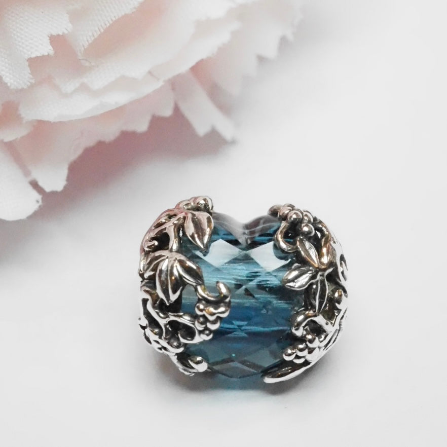 The Charming Kanya Heart is made of Midnight blue color clear glass, surrounded by an ivy pattern that is made with Sterling Silver. The heart-shaped charm faceted cut on the inside and outside especially increases the Kanya Heart to be more dazzling.