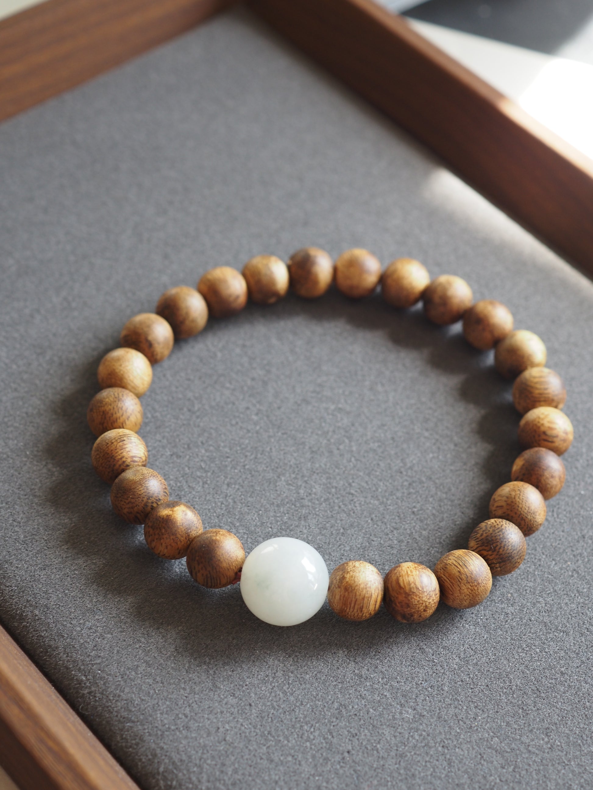 Handcrafted with a 13mm smooth white jadeite bead and 9mm agarwood beads, designed for wrists measuring 18–20 cm.