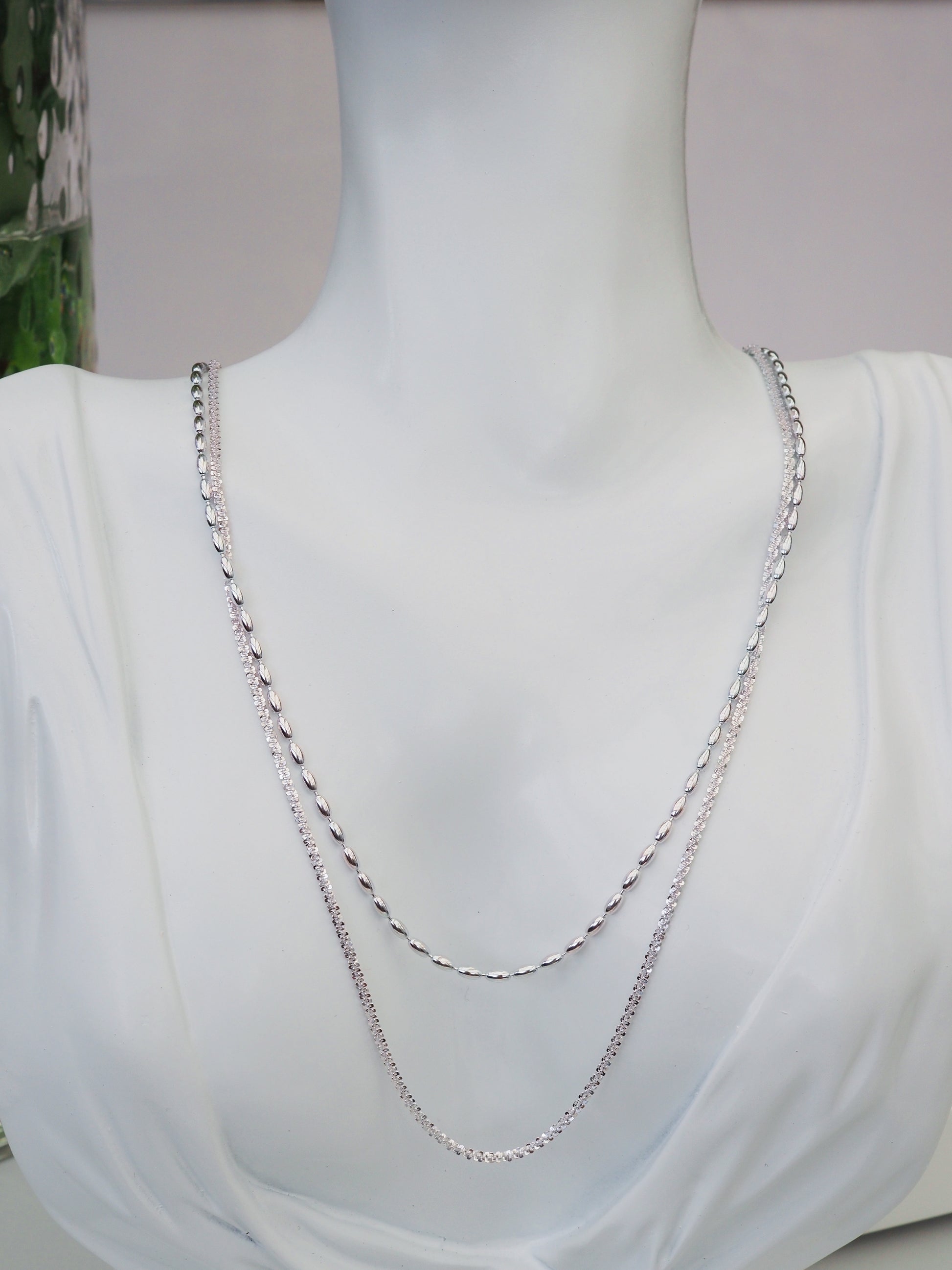 A 5cm extender allows for versatile styling. The upper strand features polished oval beads, while the lower layer showcases a reflective textured chain, creating a sophisticated layered look with maximum shine.