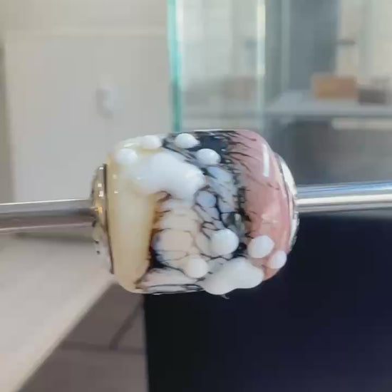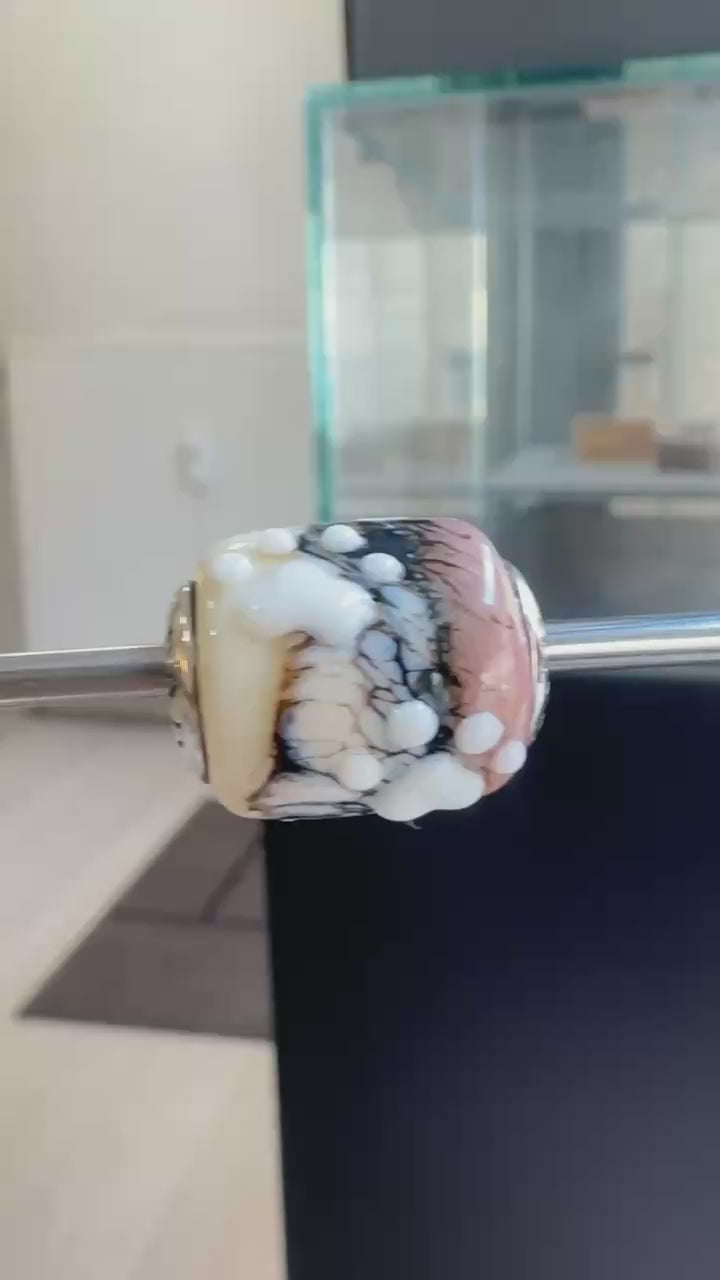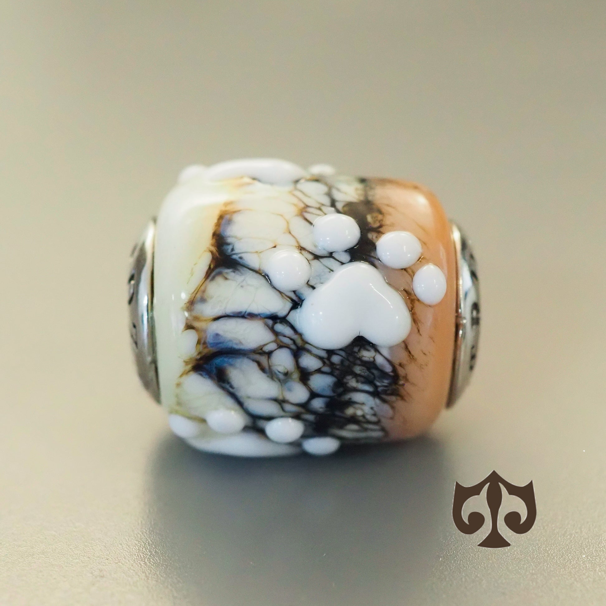 Tender Paw captures the warmth of soft beige and creamy white tones, beautifully contrasted with marble-like black veins. At its heart lies a raised white paw-print, symbolizing gentle love and loyal companionship. A bead that feels both tender and full of character. 🐾✨