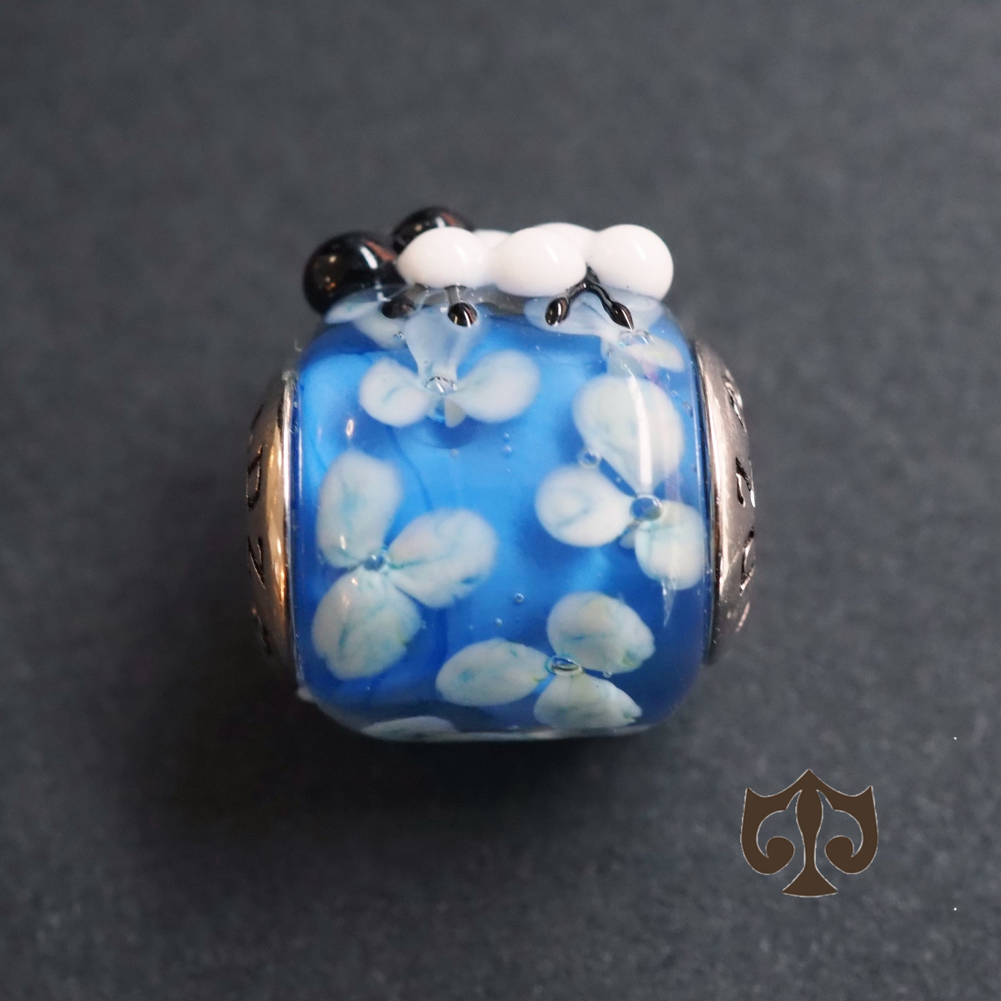 Set against a sky of delicate forget-me-not blossoms, a little white sheep wanders peacefully, soft as a cloud. This bead captures the warmth of a pastoral day and the innocence of simple joys — a gentle reminder to never forget the moments that make your heart smile.